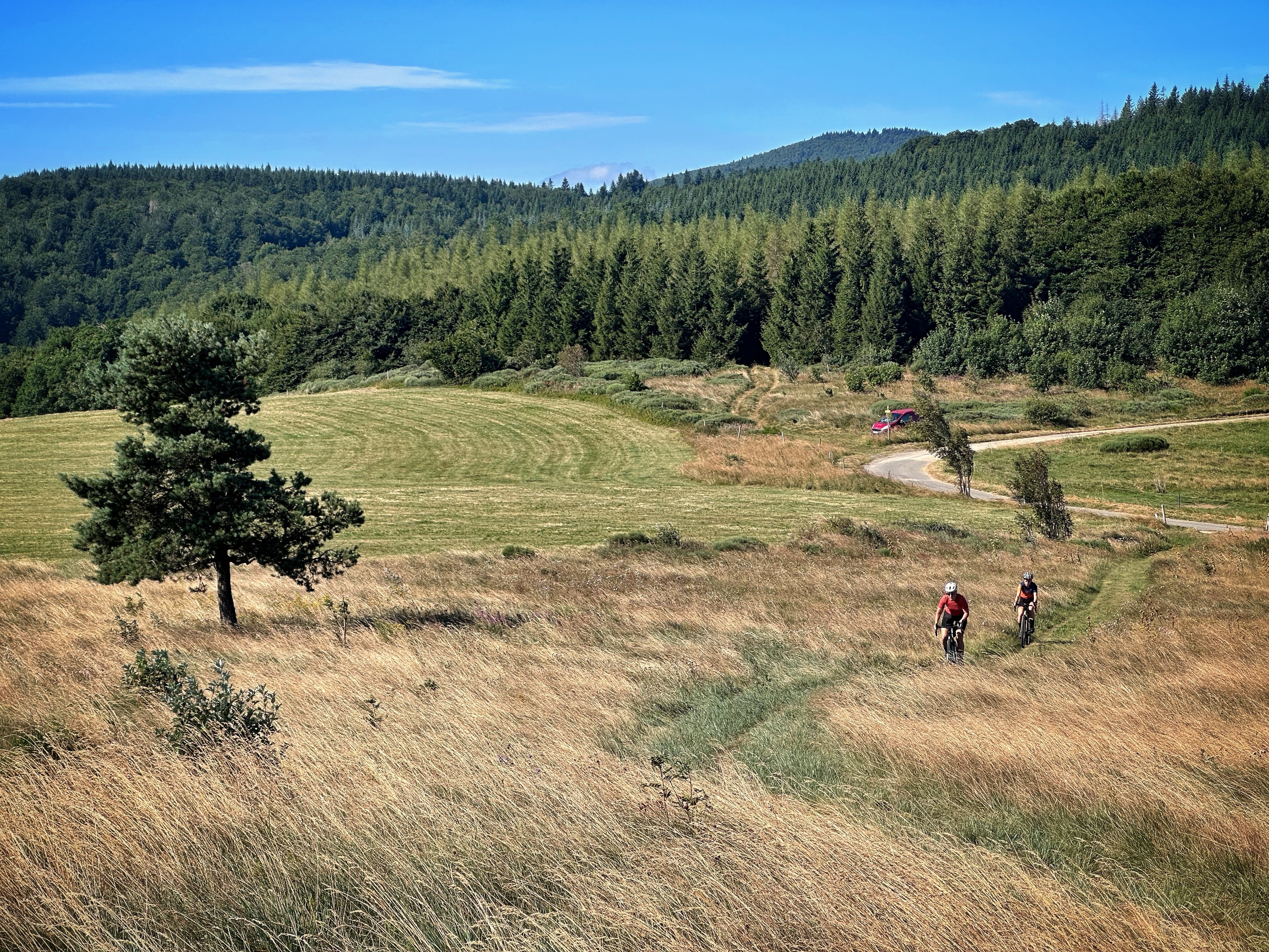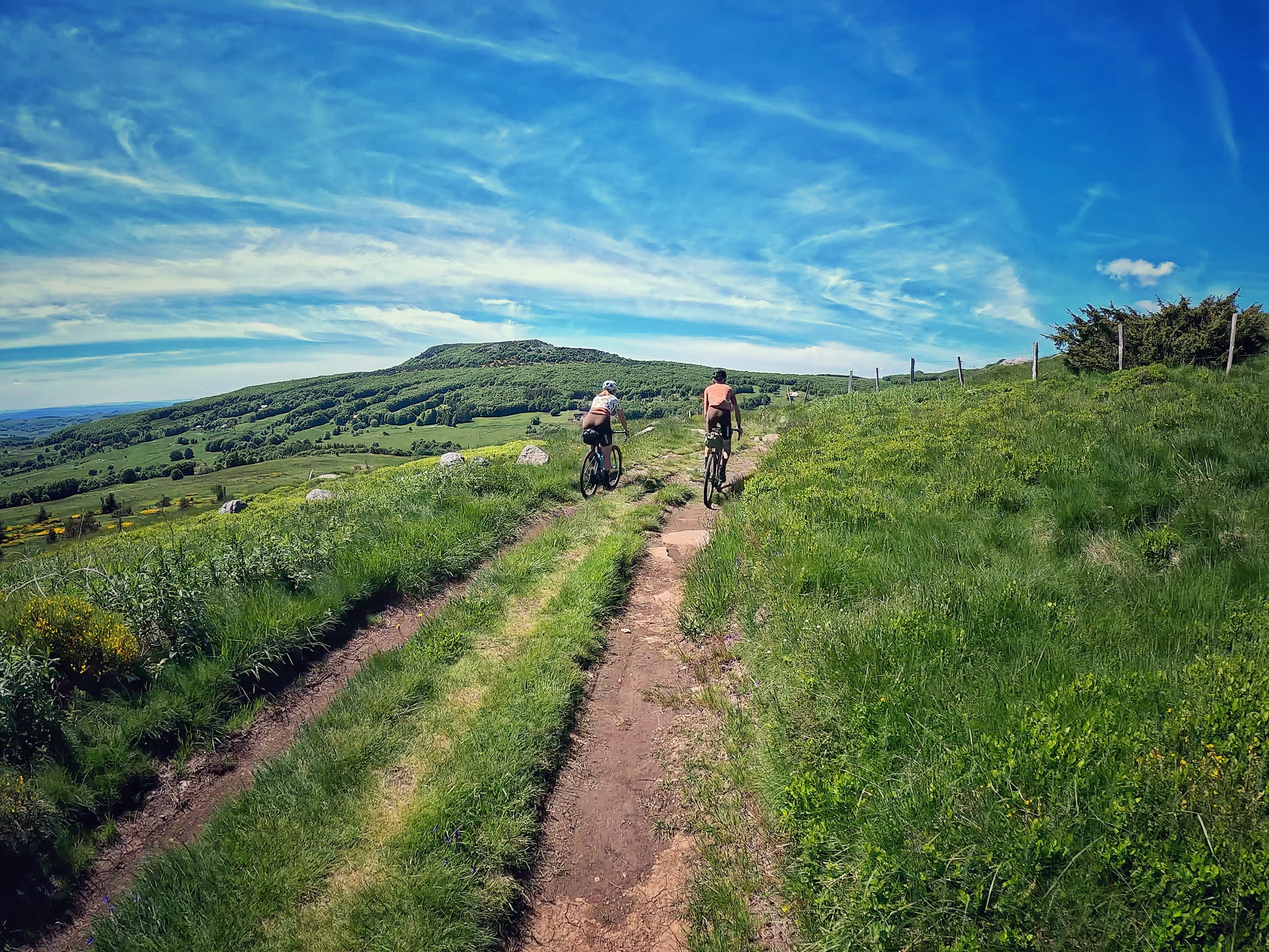 ⛰️ LA grosse étape du séjour, avec une magnifique et longue montée sur le plateau ardéchois pour attaquer la journée. Paysages ultra variés au fil de l'ascension avec alternance de petites routes et sections très typées gravel (pistes roulantes + caillouteuses). Moment unique au sommet avec le passage au Mt Gerbier de Jonc et les sources de la Loire. Des paysages et une ambiance incroyables sur les sommets de l'Ardèche. Retour descendant juste pour le plaisir.